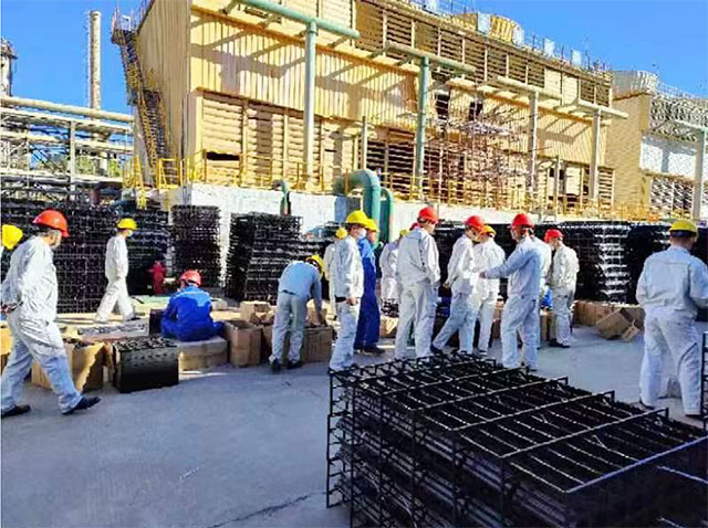 延長(cháng)石油(集團)榆林煉油廠(chǎng)于2022年9月完成2*3000t/h逆流式冷卻塔節水裝置+新型潑濺板填料的更換安裝工作,節水率20%左右(以小時(shí)補水量計),且冬季塔體周?chē)黠@降低。